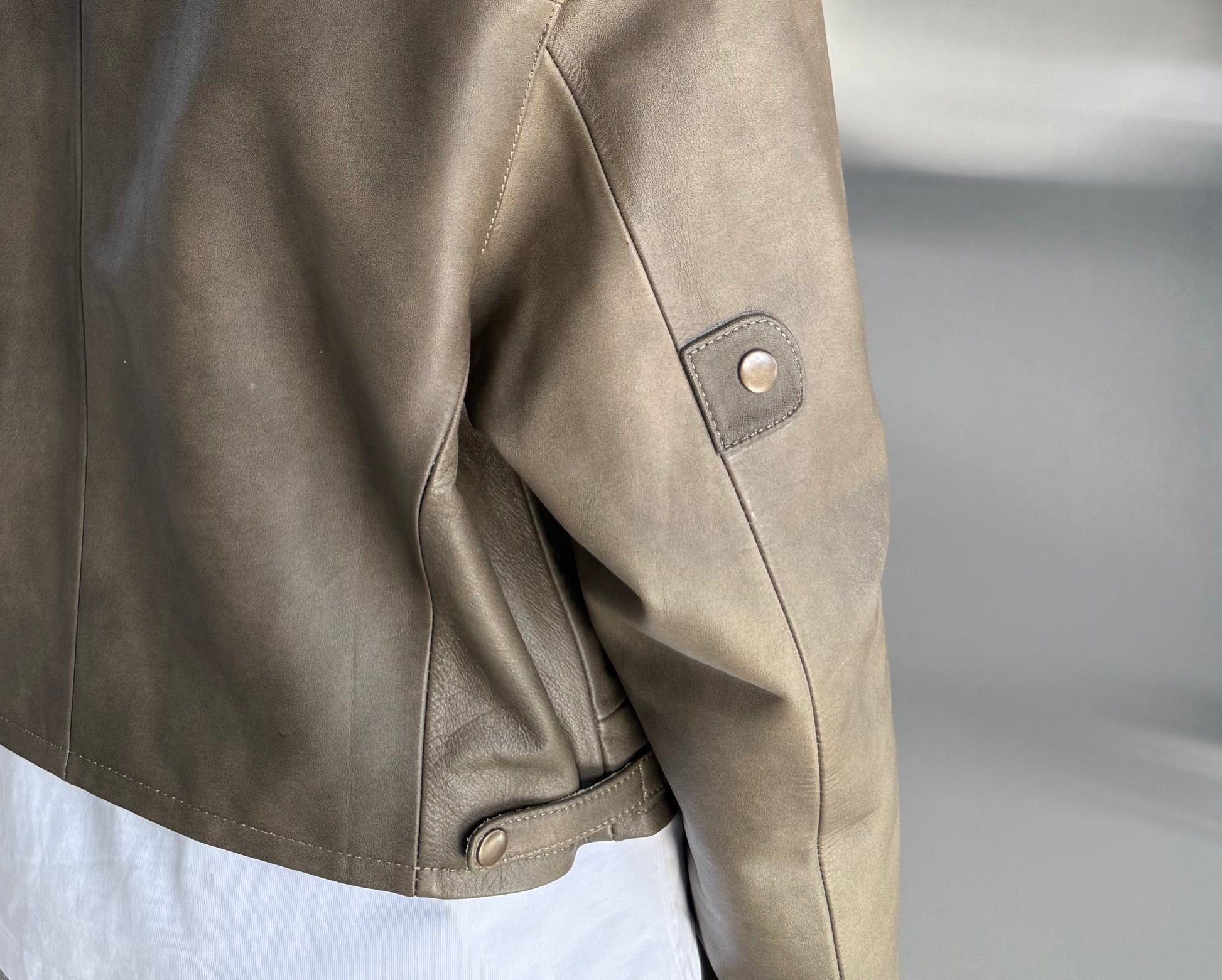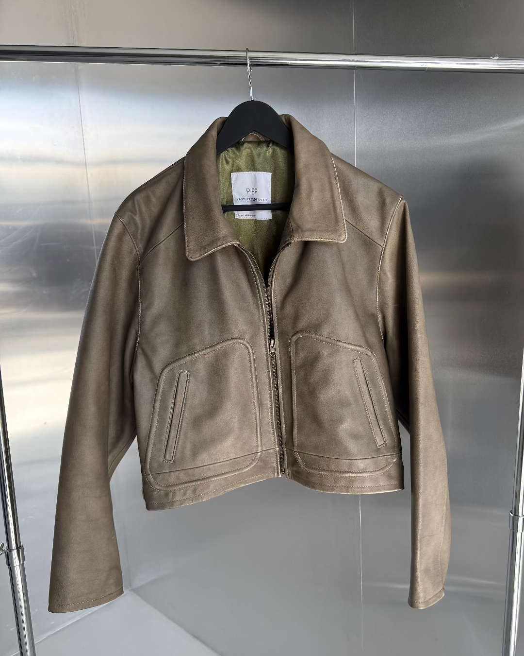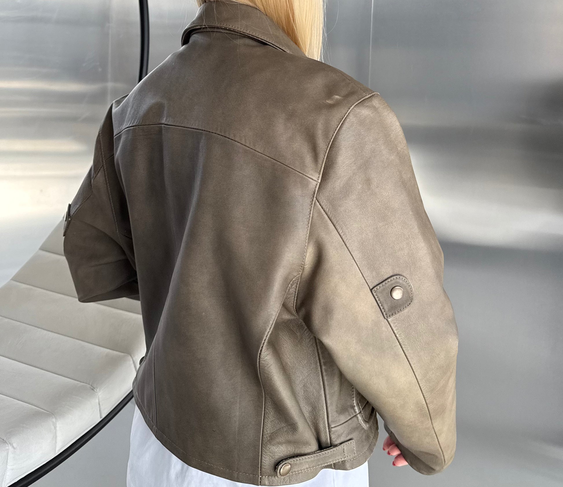 - A Khaki (light green) leather jacket featuring a classic collar.