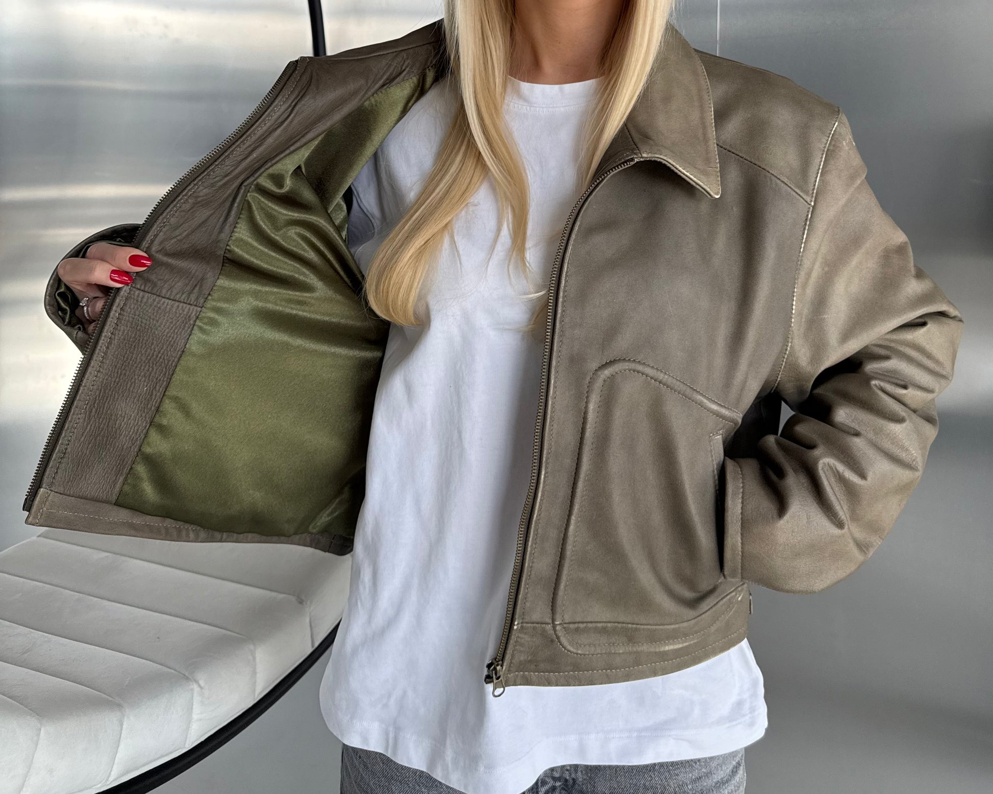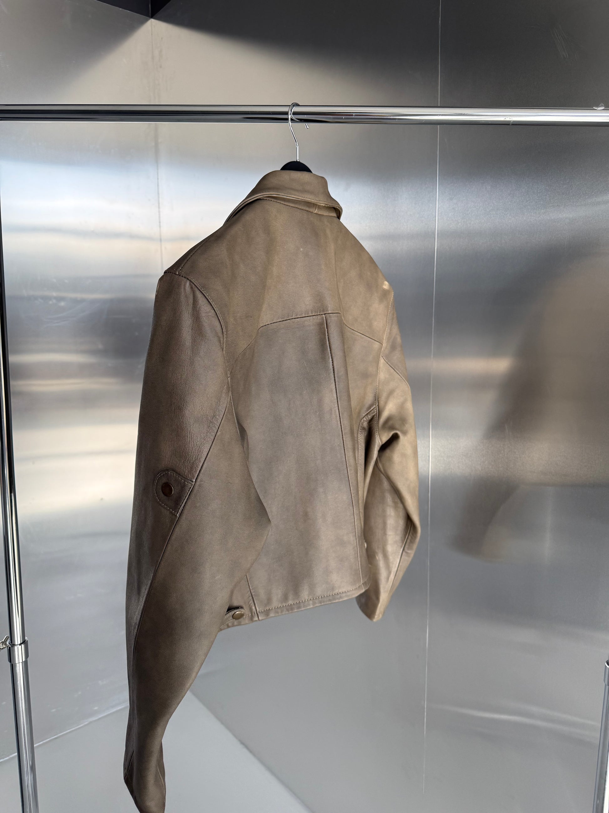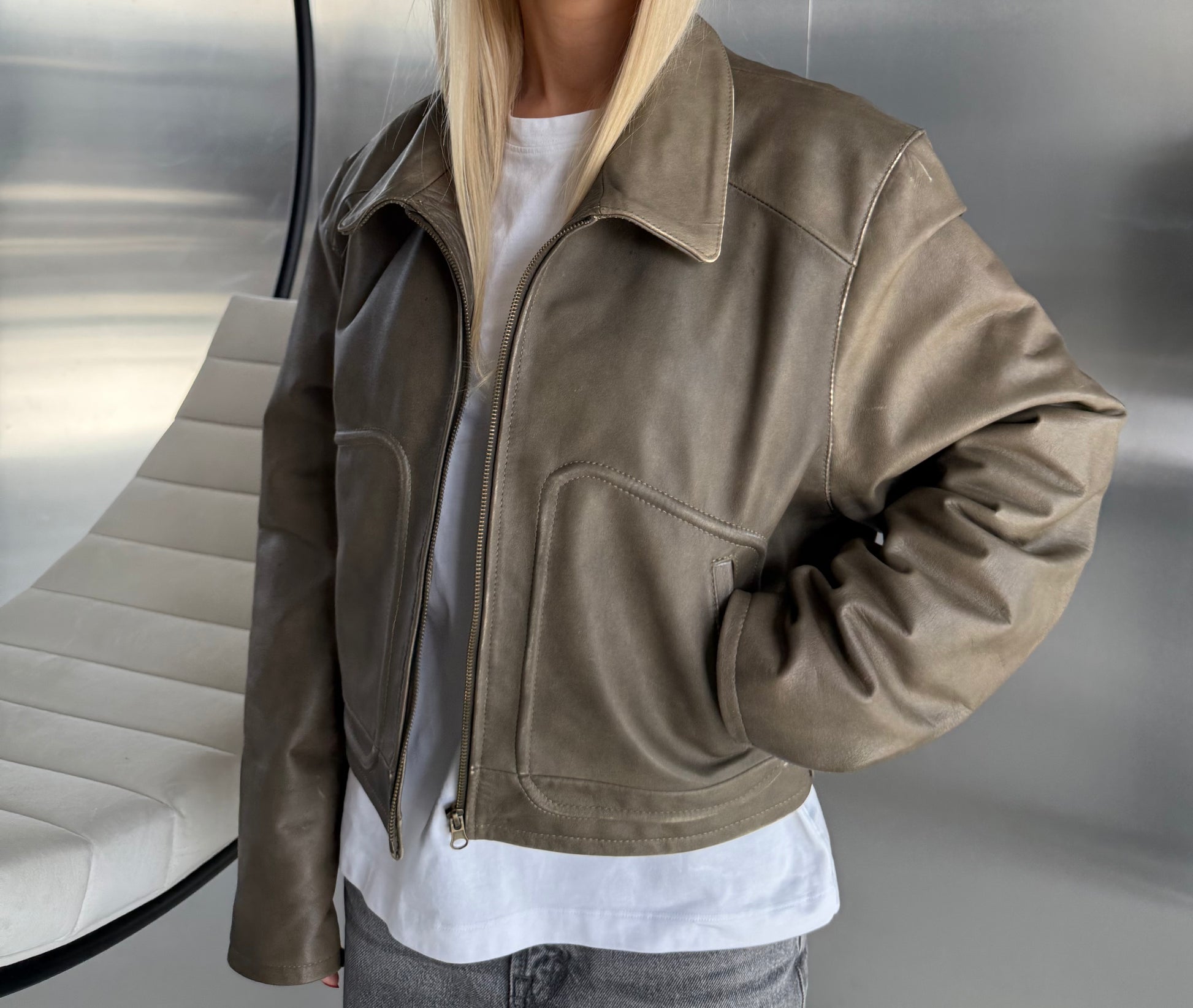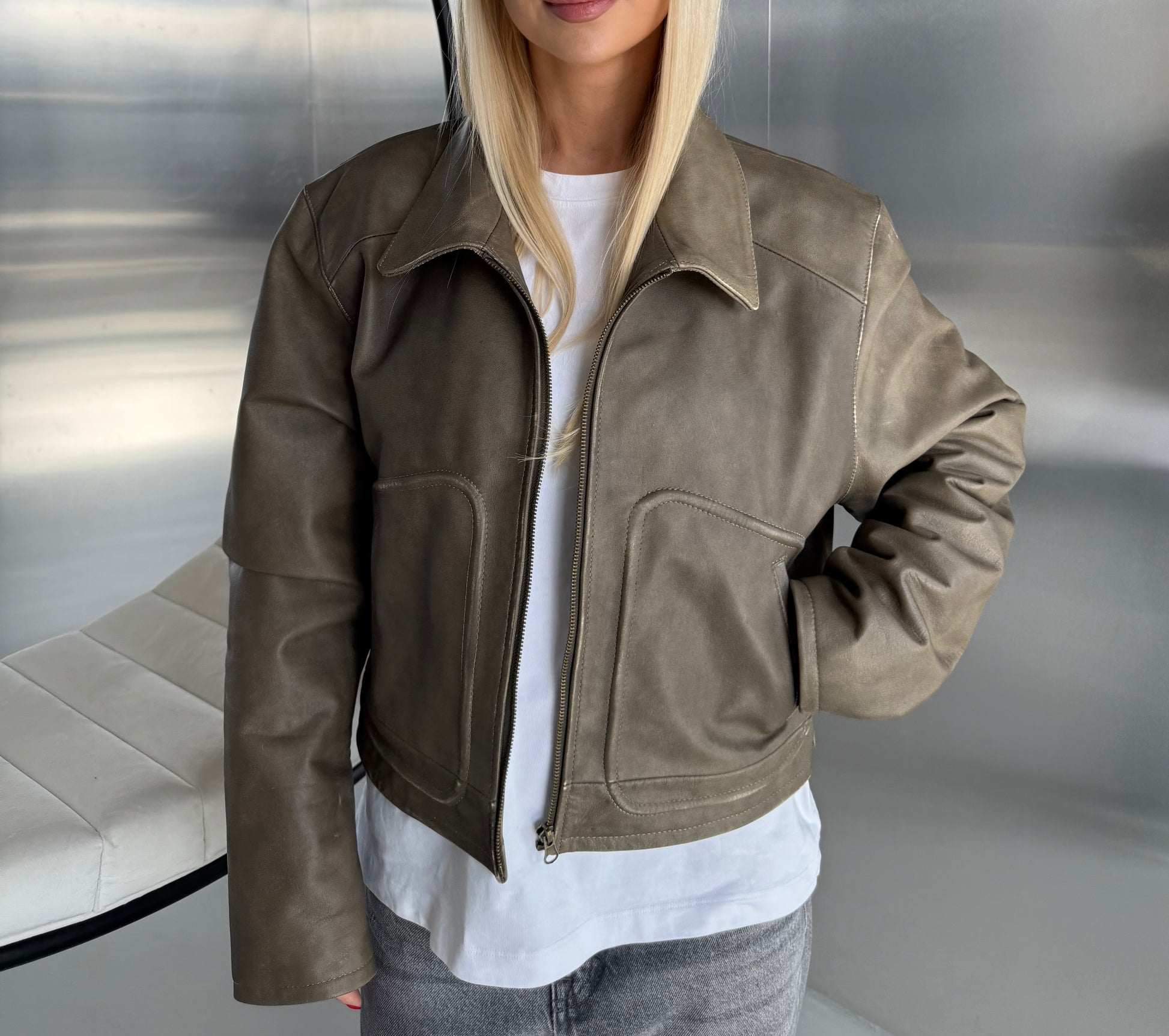 - A Khaki (light green) leather jacket featuring a classic collar.